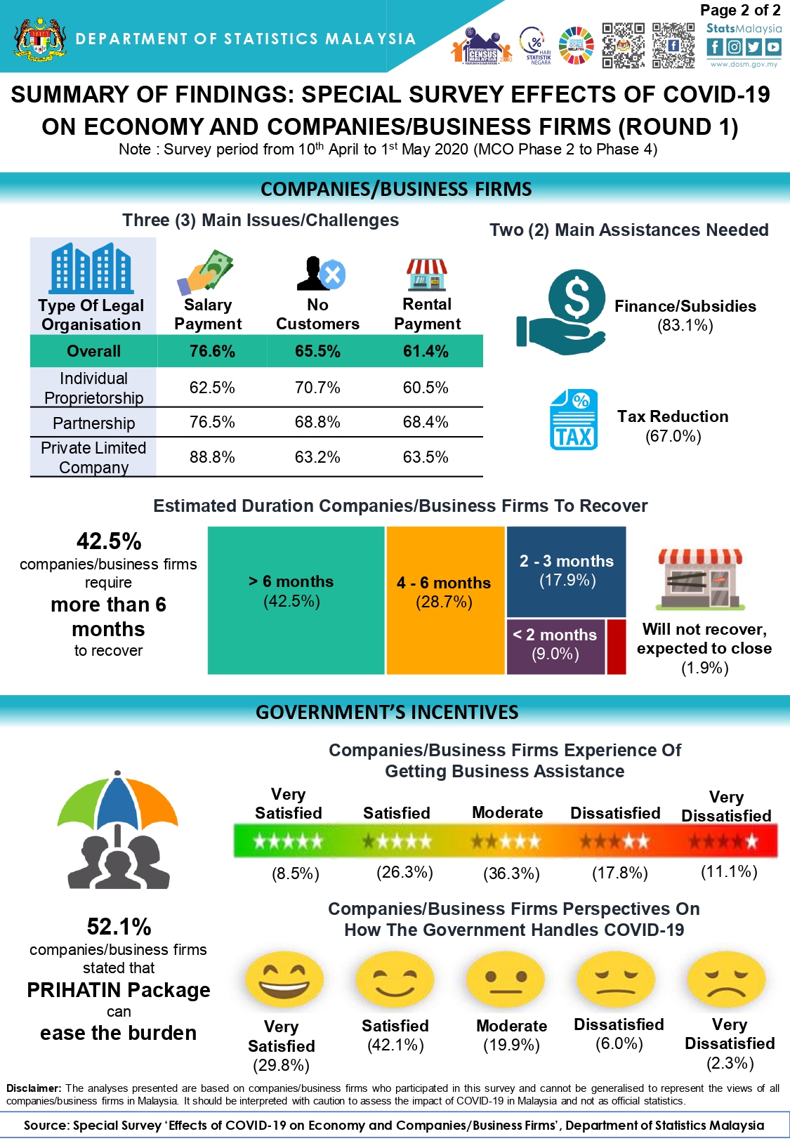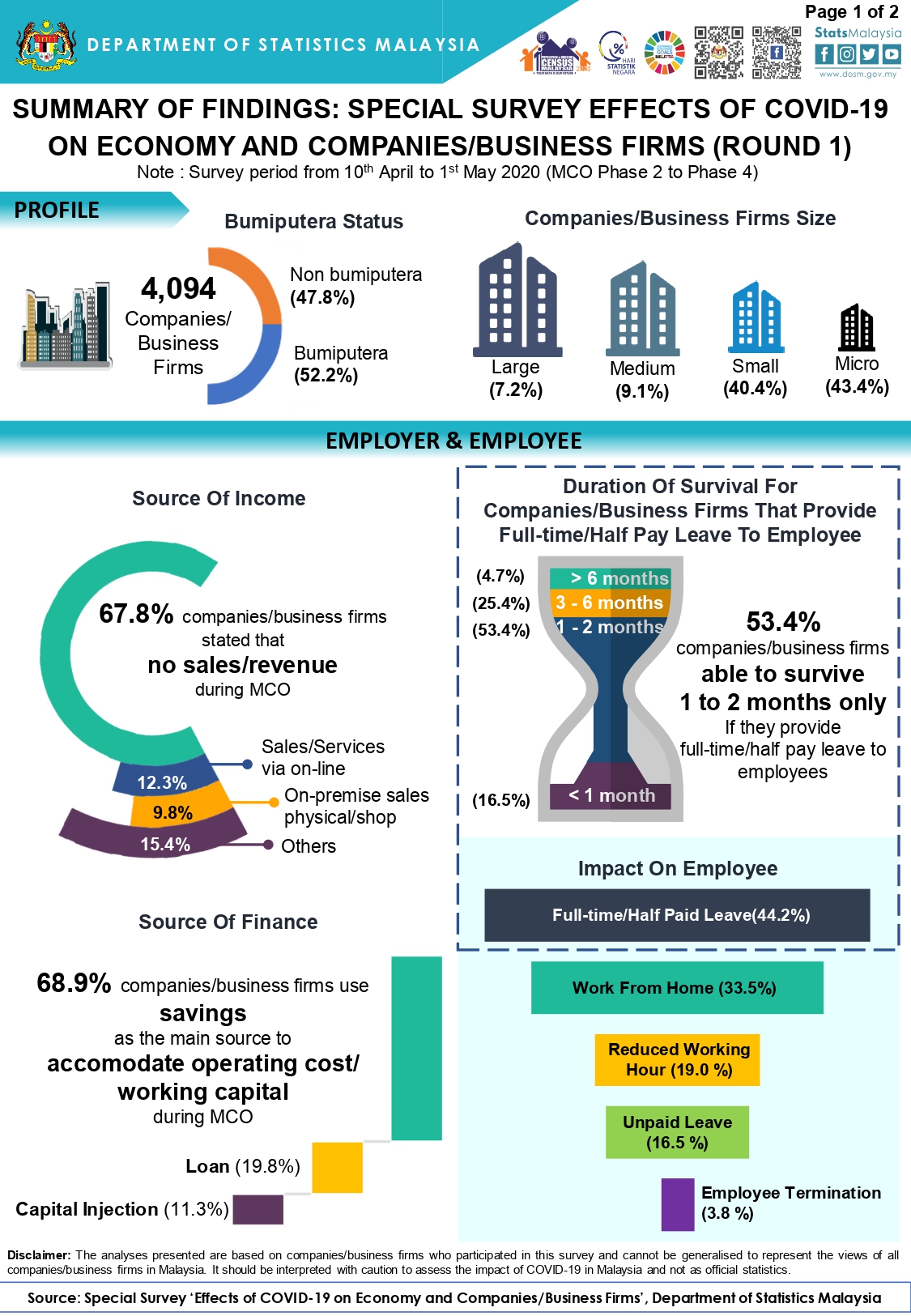 This report provides a summary of findings Special Survey ‘Effects of COVID-19 on the Economy and Companies/Business Firms’ - Round 1, was conducted online by the Department of Statistics, Malaysia for the period 10 April - 1 May 2020. A total of 4,094 company/business firms has participated in this survey. The analysis presented are based on companies/business firms feedback that includes qualitative opinion on the effects of COVID-19 on the economics and employment.