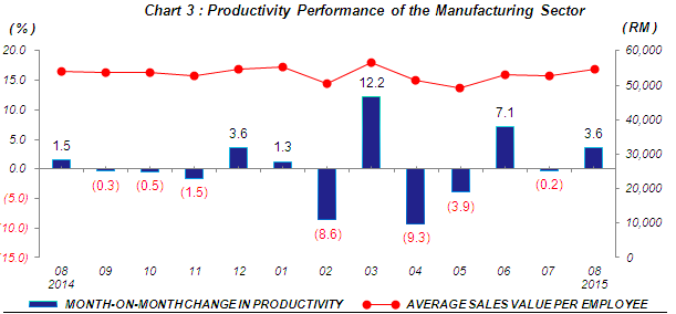 Productivity or average sales value per employee in August 2015 increased by 1.5% as compared with the same month of the previous year. Meanwhile, productivity in August 2015 increased by 3.6% month-on-month to register RM54,758 (Chart 3). |