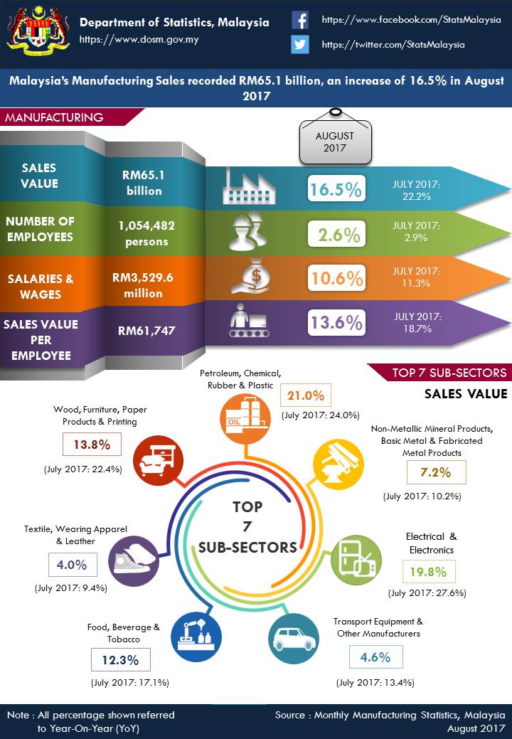 Year-on-year, the significant increase in sales value in August 2017 was due to the increase in Electrical and Electronic Products (19.8%), Petroleum, Chemical, Rubber and Plastic Products (21.0%) and Non-metallic Mineral Products, Basic Metal and Fabricated Metal Products (7.2%). These three sub-sectors contributed 80.3 per cent to the sales value of the manufacturing sector.