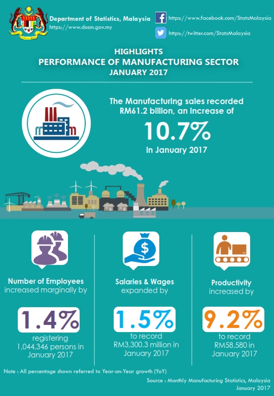 The sales value of the Manufacturing sector in January 2017 recorded RM61.2 billion, an increase of 10.7% (RM5.9 billion) as compared to RM55.3 billion reported a year ago.