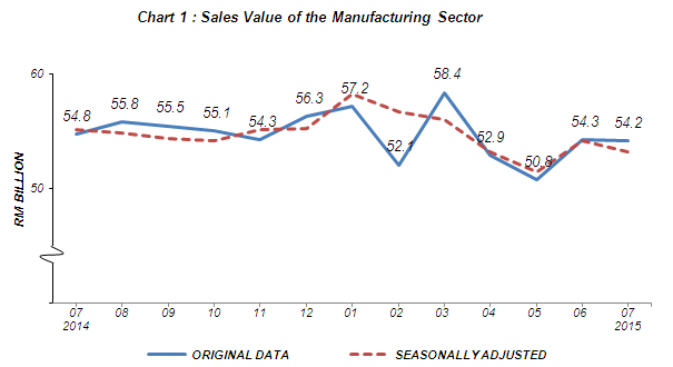 The sales value of the Manufacturing sector in July 2015 decreased by 1.2% (RM0.6 billion) to record RM54.2 billion as compared to RM54.8 billion reported a year ago (Chart 1). Meanwhile, month-on-month basis, the sales value decreased by 0.1% (RM0.1 billion) compared with the preceding month. The sales value in June 2015 remained unchanged. |