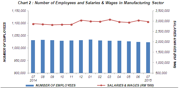 Total employees engaged in the Manufacturing sector in July 2015 was 1,023,816 persons, a decrease of 0.7% or 7,569 persons as compared to 1,031,385 persons in July 2014 (Chart 2). Meanwhile, month-on-month basis, the number of employees decreased by 0.04% as compared to 1,024,200 persons in the preceding month. |