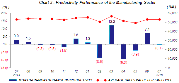 Productivity or average sales value per employee in July 2015 decreased by 0.5% as compared with the same month of the previous year. Meanwhile, productivity in July 2015 decreased by 0.1% month-on-month to register RM52,925 (Chart 3). |