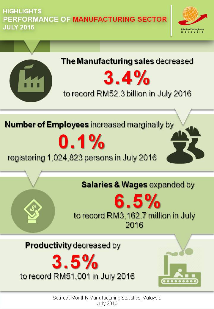 The sales value of the Manufacturing sector in July 2016 decreased 3.4% (RM1.8 billion) to record RM52.3 billion as compared to RM54.1 billion reported a year ago.