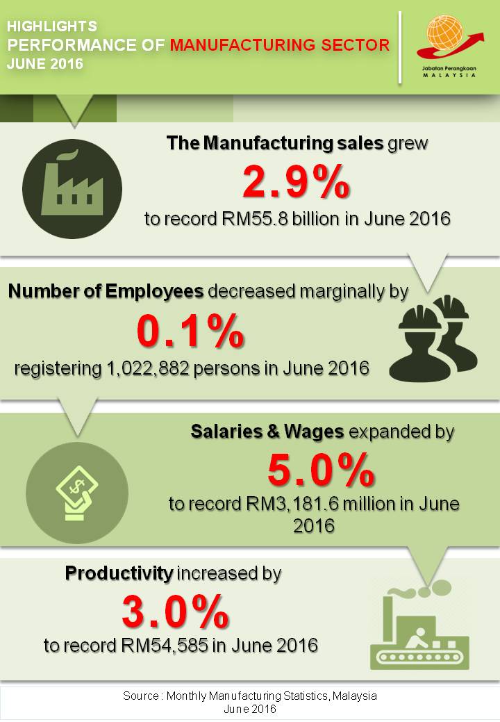 The sales value of the Manufacturing sector in June 2016 grew 2.9% (RM1.5 billion) to record RM55.8 billion as compared to RM54.3 billion reported a year ago.