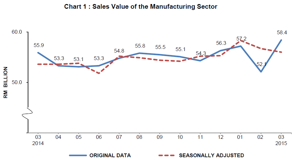 The sales value of the Manufacturing sector in March 2015 increased by 4.4% (RM2.5 billion) to record RM58.4 billion as compared to RM55.9 billion reported a year ago. Meanwhile, month-on-month basis, the sales value has increased by 12.1% (RM6.3 billion) compared with the preceding month. The sales value in February 2015 has been revised based on latest data available. |