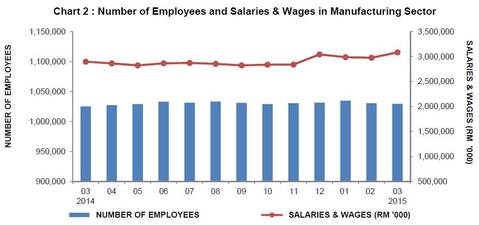 Total employees engaged in the Manufacturing sector in March 2015 was 1,029,352 persons, an increase of 0.4% or 4,255 persons as compared to 1,025,097 persons in March 2014. Meanwhile, month-on-month basis, the number of employees decreased by 0.1% compared with the preceding month. |