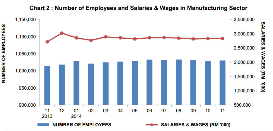| Total employees engaged in the Manufacturing sector in November 2014 was 1,030,383 persons, an increase of 0.1% compared with the preceding month. Meanwhile, year-on-year basis, the number of employees increased by 1.5% or 15,036 persons as compared to 1,015,347 persons in November 2013. The total employees in October 2014 has been revised to record 1,028,991 persons. |
