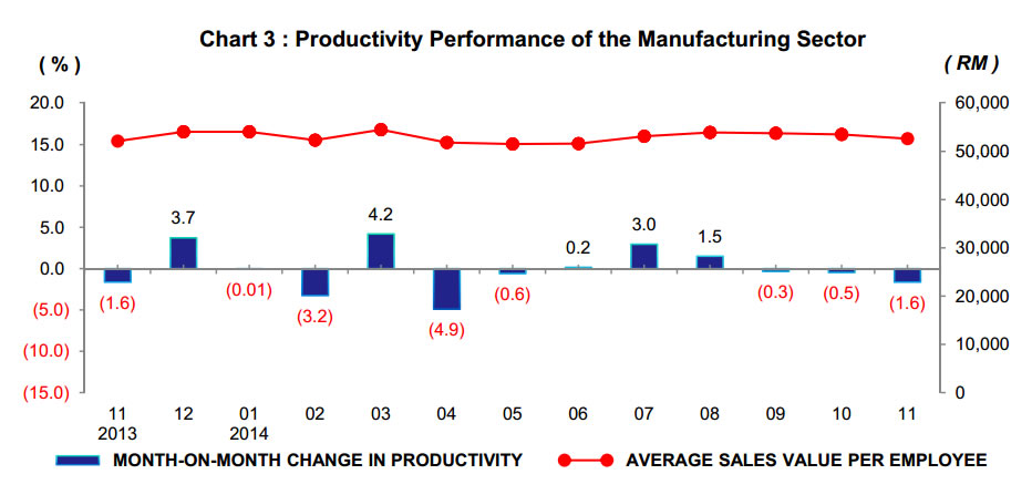 Productivity or average sales value per employee in November 2014 has decreased by 1.6% month-on-month to register RM52,672. Meanwhile, productivity in November 2014 rose 1.0% as compared with the same month of the previous year.