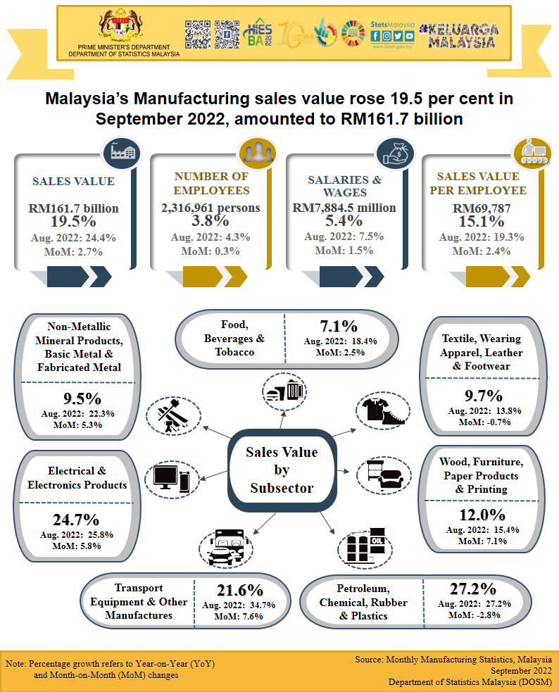 Malaysia’s Manufacturing sales value rose 19.5 per cent in September 2022, amounted to RM161.7 billion