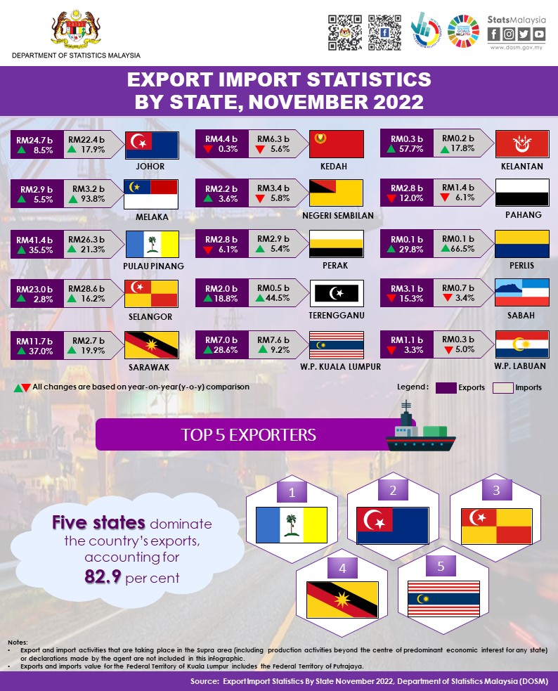 PULAU PINANG CONTINUES TO BE THE MAIN EXPORTER, WHILE SELANGOR BECAME THE MAIN IMPORTER IN NOVEMBER 2022