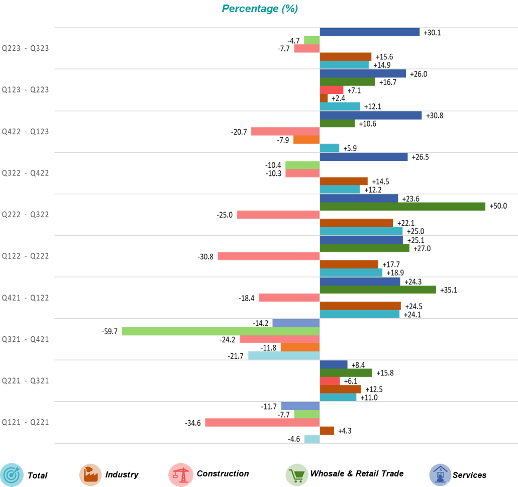 In the next six months namely April to September 2023, business outlook remained positive with a net balance of +14.9 per cent from +12.1 per cent recorded previously. Services sector showed the most optimistic sector, registering an improved net balance of +30.1 per cent as against +28.0 per cent for the first half of 2023. All sub-sectors under Services sector foresee favourable business conditions in the next six months. Concurrently, Industry sector recorded a brighter net balance with +15.6 per cent in the forthcoming six months compared to +2.4 per cent recorded previously.