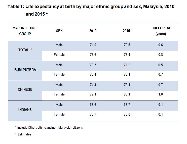 All ethnic groups recorded an increase for life expectancy at birth for the period of 2010 to 2015. The highest increase of life expectancy for males recorded by Chinese with 0.7 years, followed by Bumiputera (0.5 years) and Indians (0.1 years). Chinese also had the highest increase of life expectancy for female by 1.0 years followed by Bumiputera (0.7 years) and Indians (0.1 years).