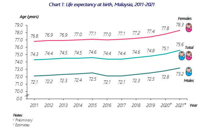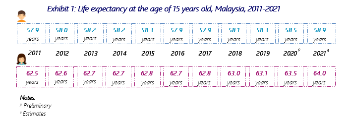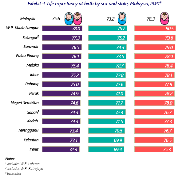 In 2021, there are four states with the highest life expectancies for males compared with the national level (73.2 years) namely W.P. Kuala Lumpur (75.7 years), Selangor (75.2 years), Sarawak (74.3 years) and Pulau Pinang (73.5 years). While for females, five states that surpassed the national life expectancy (78.3 years) comprise W.P. Kuala Lumpur (80.5 years), Selangor (79.6 years), Sarawak (79.0 years), Pulau Pinang (78.9 years) and Melaka (78.4 years). [Exhibit 4]