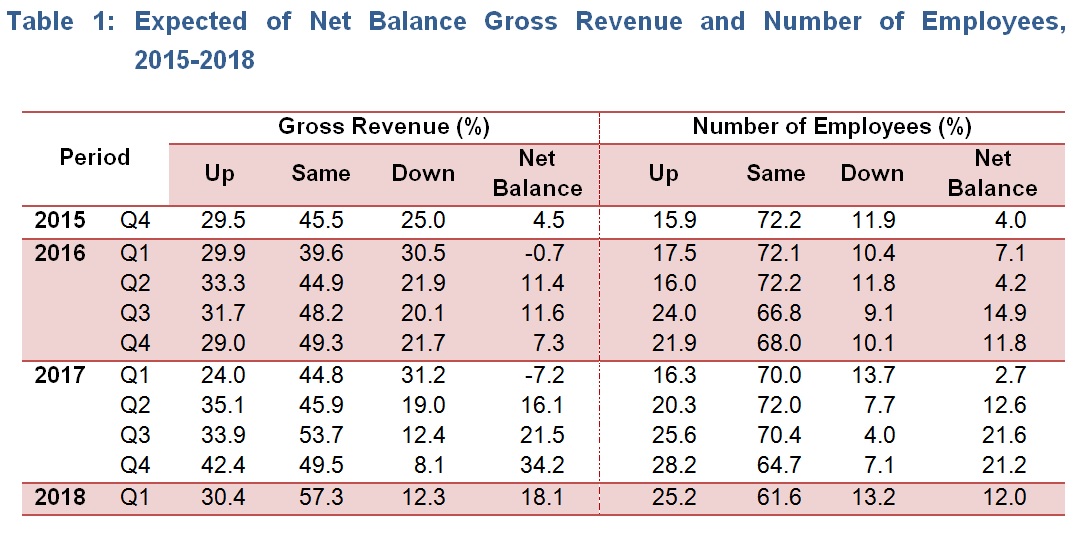 The gross revenue in the first quarter of 2018 is expected to increase with a net balance of +18.1 per cent which 30.4 per cent of establishments expected an increase while 12.3 per cent of establishments foresee a decrease.