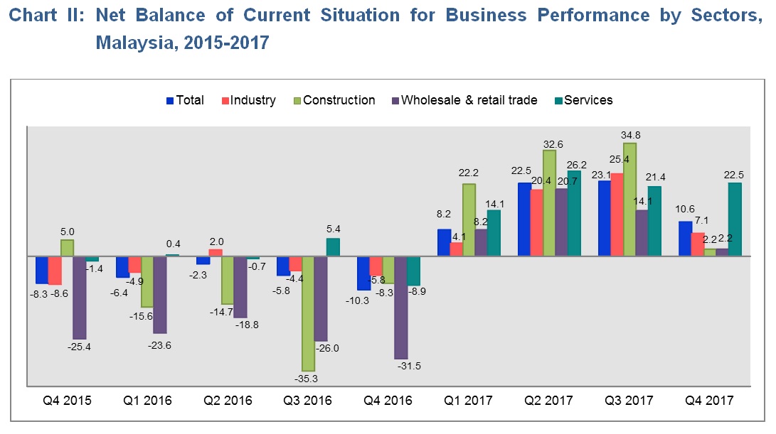 The current situation of business performance in the fourth quarter 2017 still positive with an overall net balance +10.6 per cent. The increase was contributed by industry (+7.1%), construction (+2.2%), wholesale & retail trade (+2.2%) and services (+22.5%).