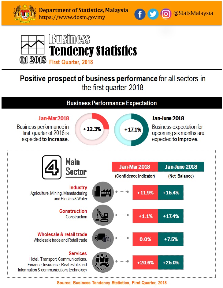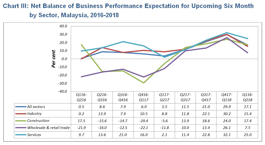 The business performance in January to June 2018 is expected to increase with a net balance of +17.1 per cent. All sectors namely industry, construction, wholesale & retail trade and services are expected to increase with the net balance of +15.4 per cent, +17.4 per cent, +7.5 per cent and +25.0 per cent respectively.