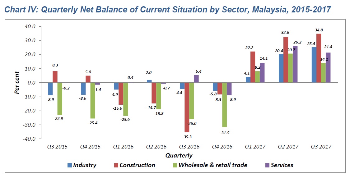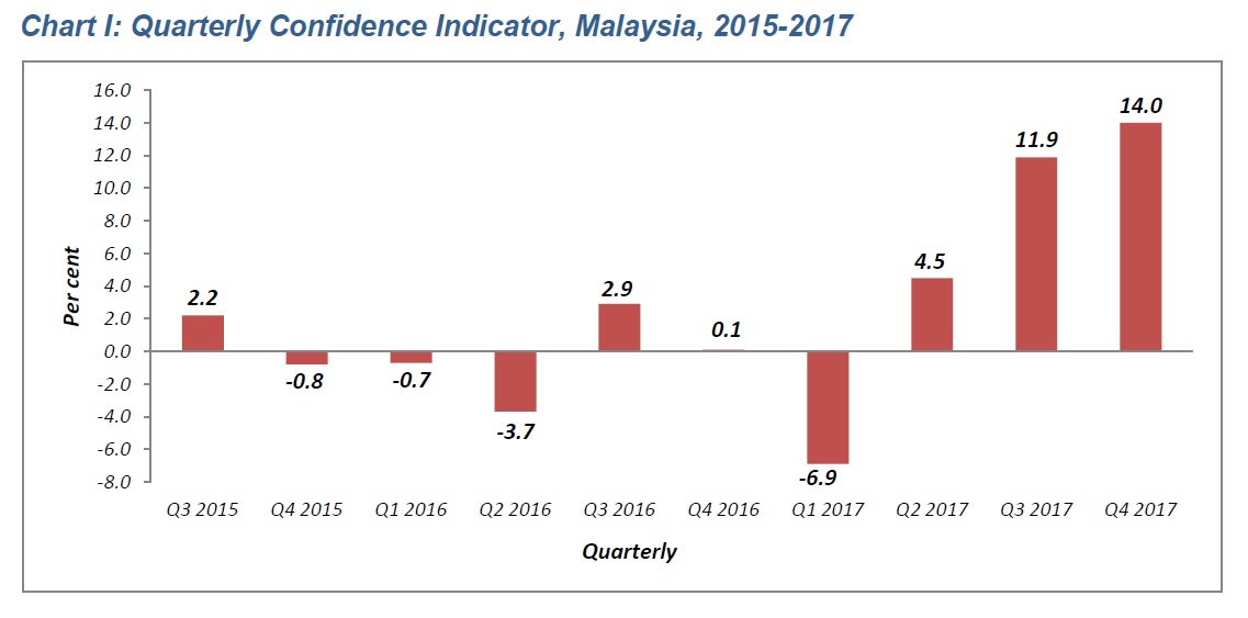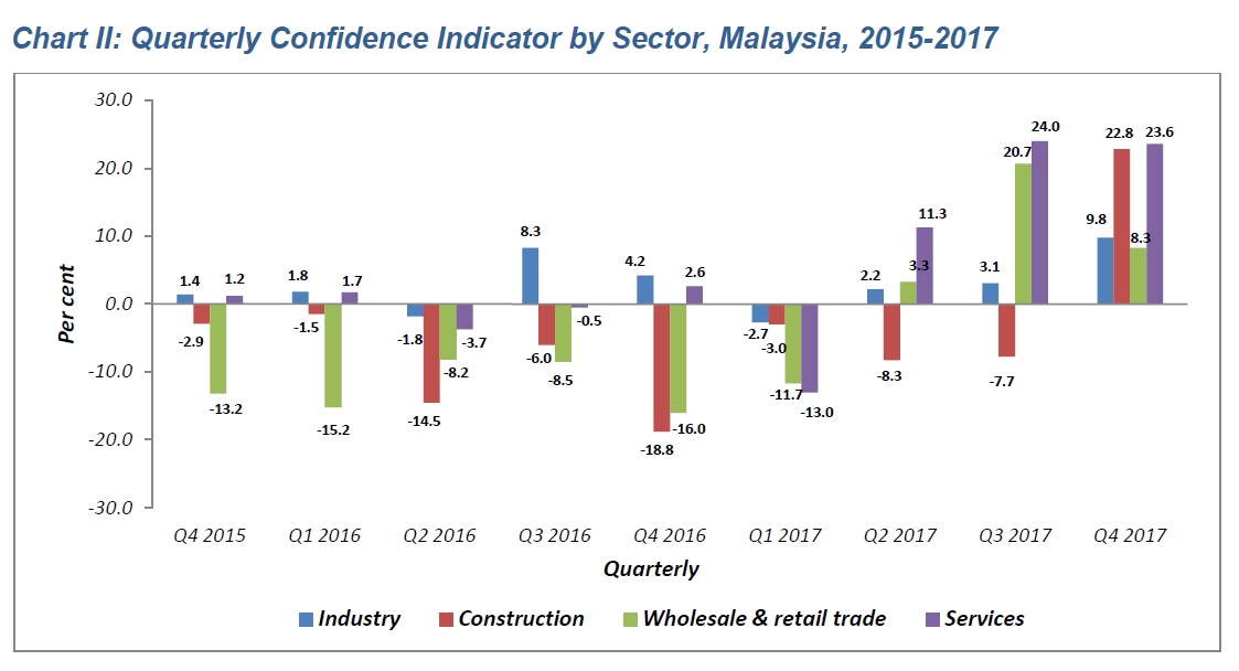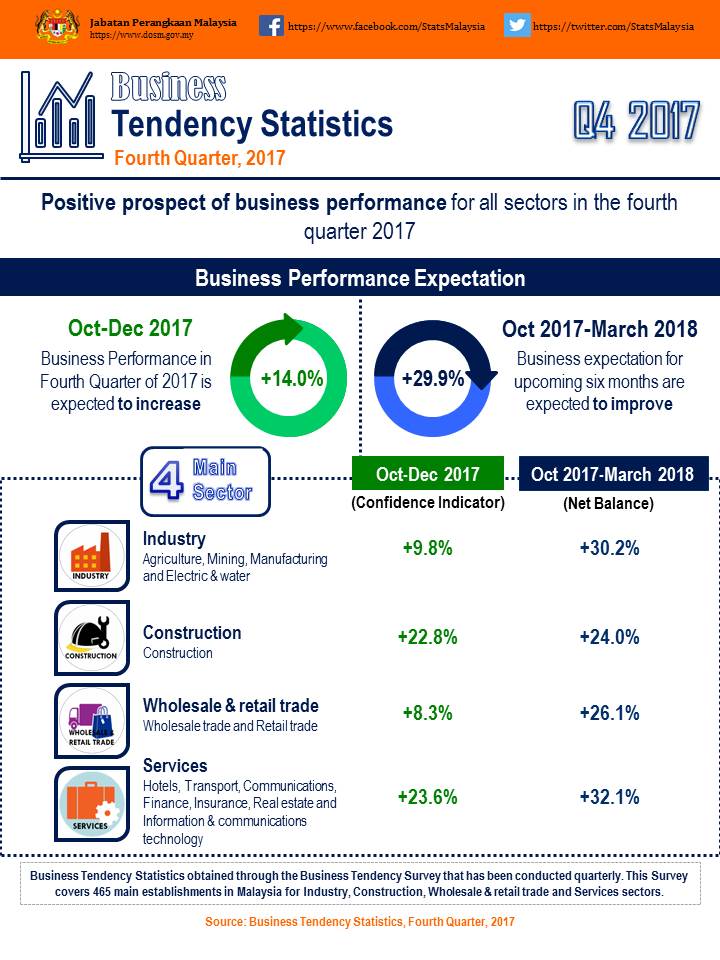 The business performance in the fourth quarter of 2017 is expected to increase as recorded by the confidence indicator of +14.0 per cent contributed by industry (+9.8%), construction (+22.8), wholesale & retail trade (+8.3%) and services (+23.6%) sectors.