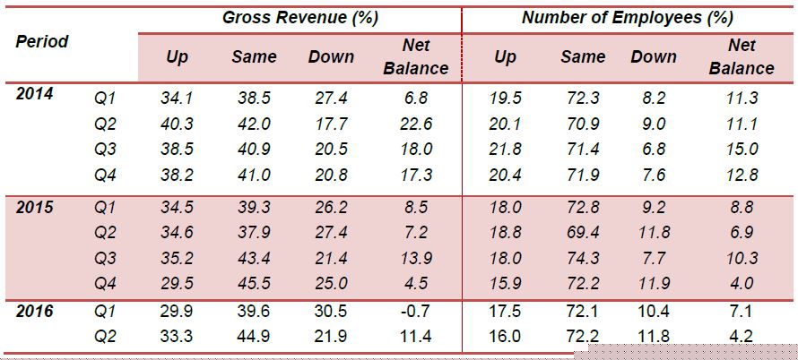 Table 3: Net Balance of Current Situation for Gross Revenue and Number of Employees, 2013-2016