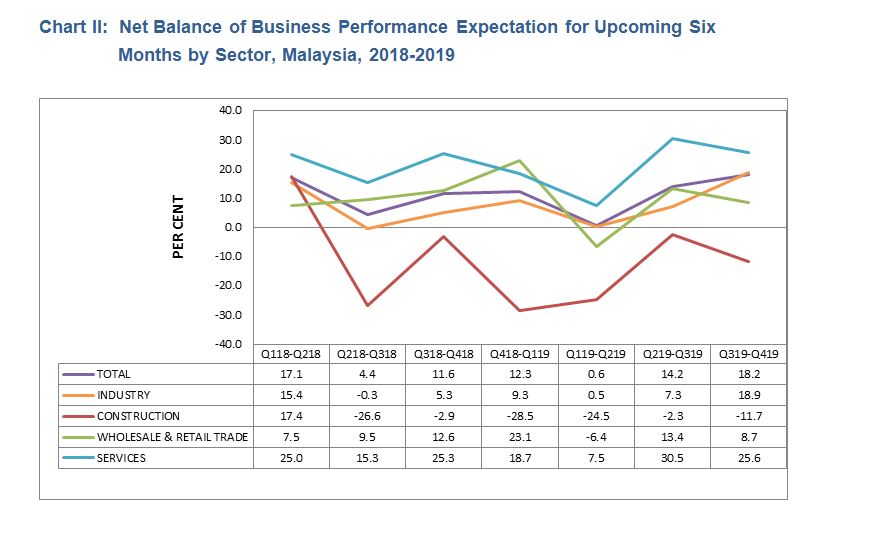 Within the surveyed sectors, Services sector continued as the most optimistic sector, with the confidence indicator recorded at +11.5 per cent in the third quarter 2019. Confidence indicator for Industry sector rebounded to +0.7 per cent in the third quarter of 2019 as compared to -6.7 per cent reported in the previous quarter. Meanwhile, Construction and Wholesale & Retail Trade sectors demonstrated pessimism in the third quarter of 2019 where the confidence indicators registered at -12.8 per cent and -0.1 per cent, respectively.