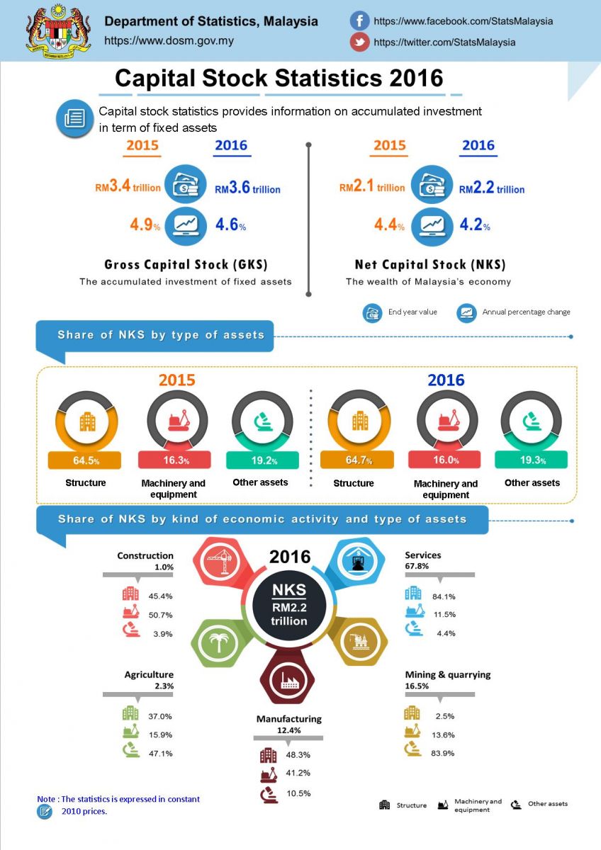 Net Capital Stock (NKS) which represents the wealth of Malaysia’s economy in term of fixed assets increased to RM2.2 trillion and grew by 4.2 per cent. Services remained as the largest contributor to NKS with a share of 67.8 per cent. Mining & quarrying constituted of 16.5 per cent and Manufacturing was 12.4 per cent. By type of assets, structure was major contributor to Services with 84.1 per cent while other assets was dominated in Mining & quarrying accounted for 83.9 per cent.