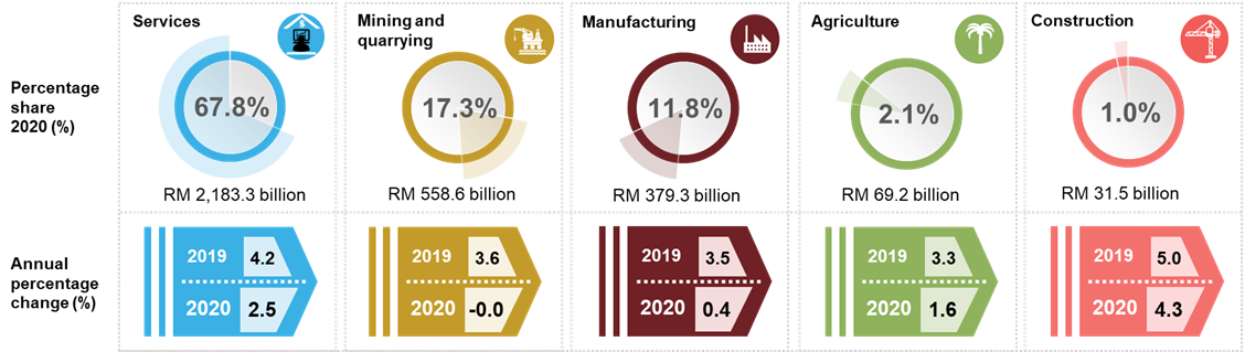 The Manufacturing sector grew marginally at 0.4 per cent in 2020 compared to 3.5 per cent in 2019. The slower growth was attributed by Petroleum, chemicals, rubber & plastic products with a growth of 0.8 per cent (2019: 5.7%) and Electrical, electronic & optical products at 0.6 per cent (2019: 3.9%). However, both subsectors remained as the main contributors to the Manufacturing sector with a share of 36.0 per cent and 33.3 per cent respectively.