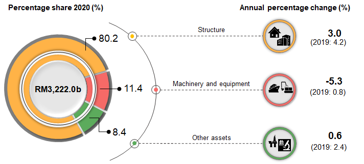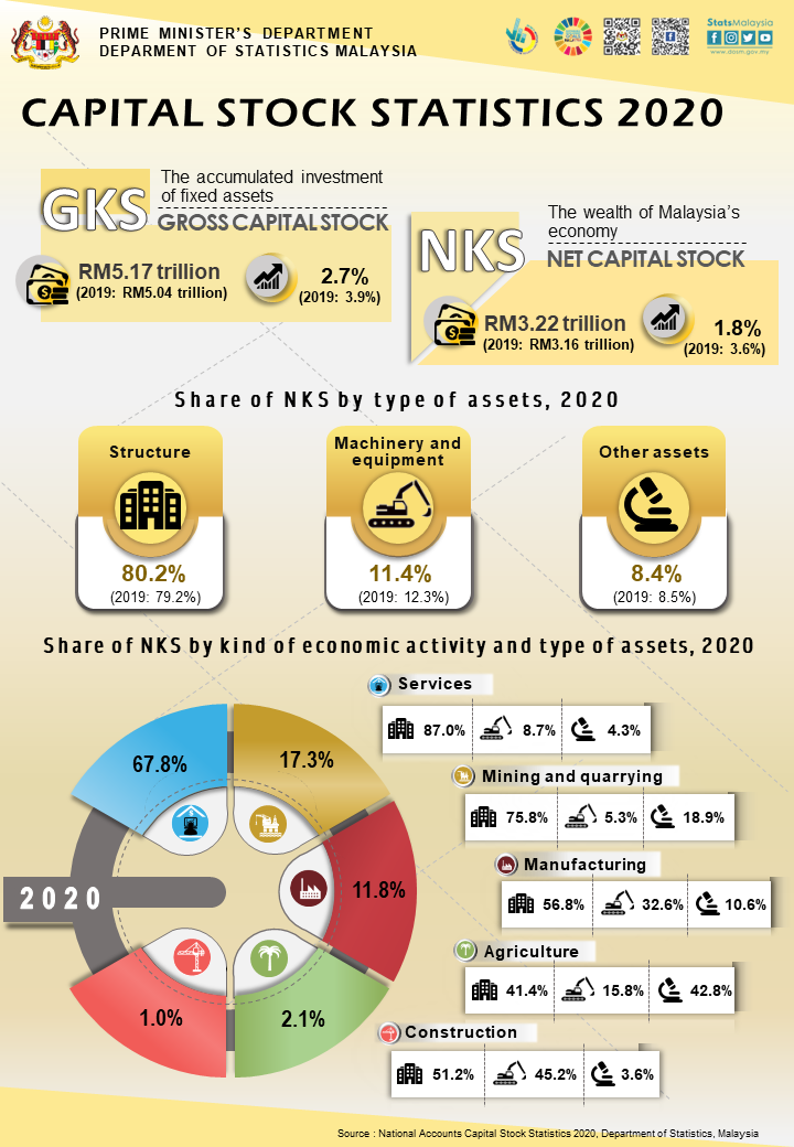 Gross Capital Stock (GKS), which reflects Malaysia's accumulated investments of fixed assets, amounted to RM5.2 trillion with a growth of 2.7 per cent in 2020. Concurrently, Net Capital Stock (NKS) that represents the wealth of Malaysia's economy grew slower by 1.8 per cent with a value of RM3.2 trillion. Productive assets that are measured through Productive Capital Stock (PKS) recorded RM4.2 trillion compared to the previous year RM4.1 trillion. Meanwhile, Consumption of Fixed Capital (COFC) which represents the value of the assets used up in the production process in 2020 posted RM227.0 billion with a growth of 1.9 per cent. The slower growth of GKS, PKS and NKS are the effects of the reduction in investments as a result of the COVID-19 pandemic which has influenced the performance of all economic activities.