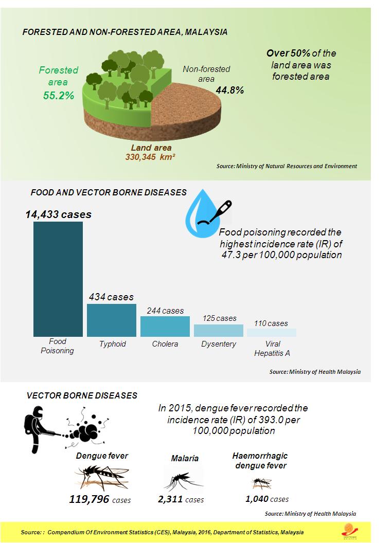 Generally, human activities has caused environment quality degradation and affected the human health. Contaminated food and water intake can cause five types of Food and Water Borne Diseases that are cholera, typhoid, dysentery, viral hepatitis A and food poisoning. In 2015, the incidence rate (IR) of food poisoning was the highest at 47.3 per 100,000 population.