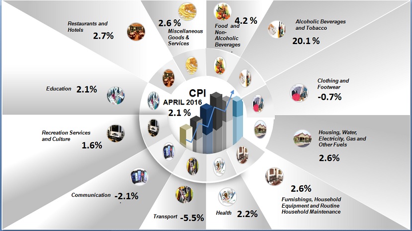 The increase of 3.2 per cent in the CPI for period January to April 2016 was led by increases in the main groups with high expenditure percentages: Food & Non-Alcoholic Beverages (+4.5 per cent) and Housing, Water, Electricity, Gas & Other Fuels (+2.8 per cent). Other increases were Alcoholic Beverages & Tobacco (+22.0 per cent); Miscellaneous Goods & Services (+4.6 per cent); Restaurants & Hotels (+4.1 per cent); Furnishing, Household Equipment & Routine Household Maintenance (+4.0 per cent) and Health (+3.9 per cent).