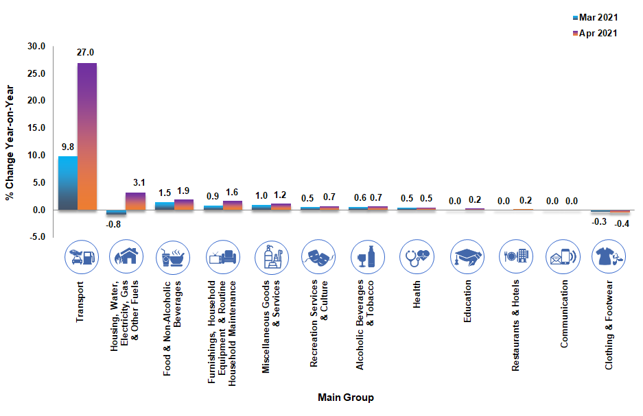 Consumer Price Index (CPI) increased 4.7 per cent in April 2021 to 123.1 as against 117.6 in the same month of the preceding year. The increase in the overall index was driven mainly by Transport (27.0%); Housing, Water, Electricity, Gas & Other Fuels (3.1%); Food & Non-Alcoholic Beverages (1.9%); Furnishings, Household Equipment & Routine Household Maintenance (1.6 %) and Miscellaneous Goods & Services (1.2%).
