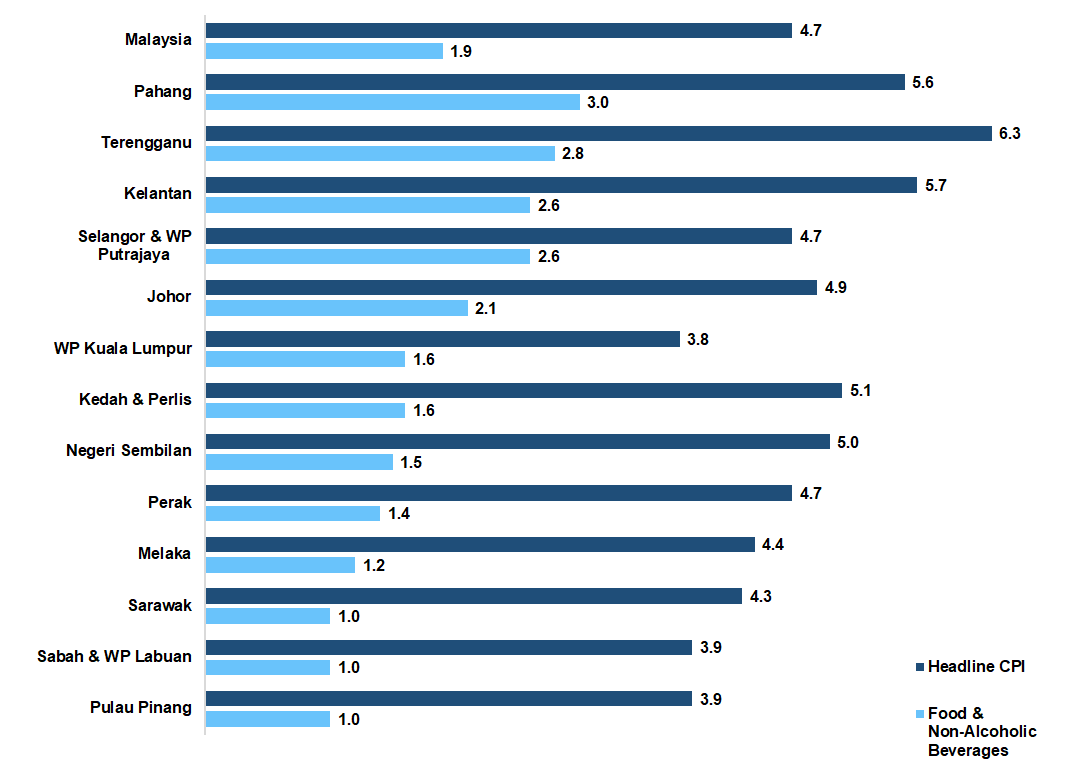 All states registered an increase in the index of Food & Non-Alcoholic Beverages. The highest increase was recorded by Pahang at 2.2 per cent. This was followed by Terengganu (2.8%), Selangor & Wilayah Persekutuan Putrajaya (2.6%), Kelantan (2.6%) and Johor (2.1%).