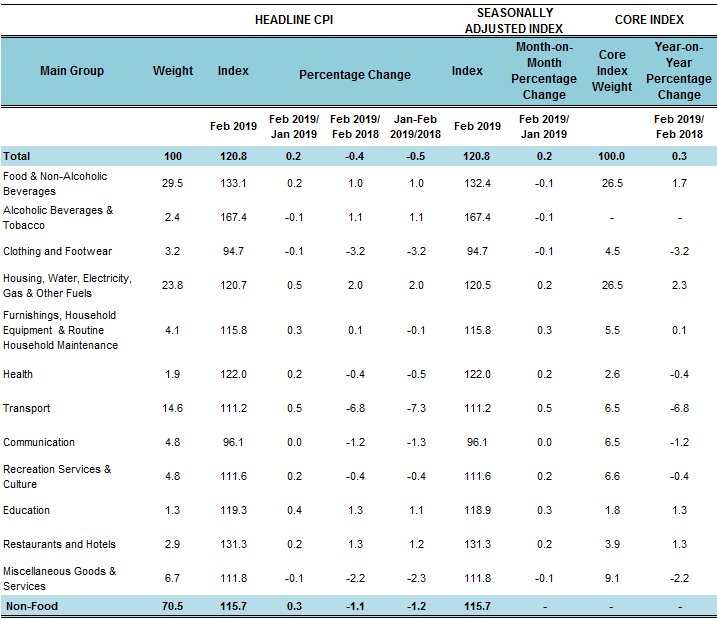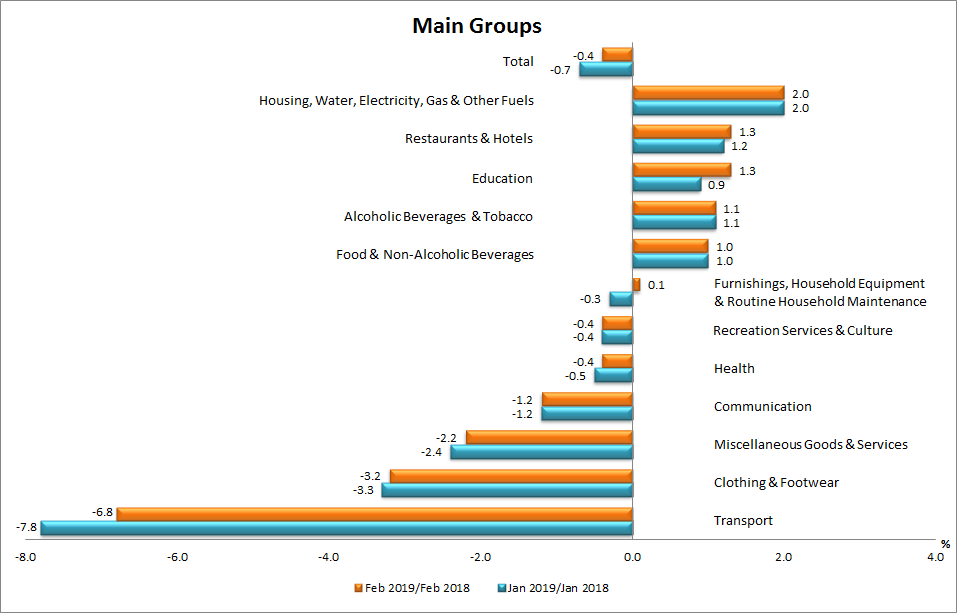 The overall index for Consumer Price Index (CPI) posted -0.4 per cent in February 2019 as compared to -0.7 per cent in the previous month. In terms of index number, the CPI recorded 120.8 as against 121.3 in corresponding month of the preceding year. The decrease in the index of Transport (-6.8 per cent) which contributed 14.6 per cent of overall weight was countered by the increase in the index of Housing, Water, Electricity, Gas & Other Fuels (+2.0 per cent) and Food & Non-Alcoholic Beverages (+1.0 per cent).