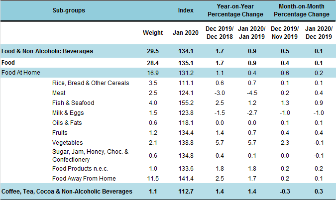 The index for Food & Non-Alcoholic Beverages increased 0.9 per cent in January 2020 as compared to the same month of the previous year. The increase was attributed by the food sub-group of Vegetables (5.7%), Food Products not elsewhere classified (1.8%) and Fish & Seafood (1.2%).