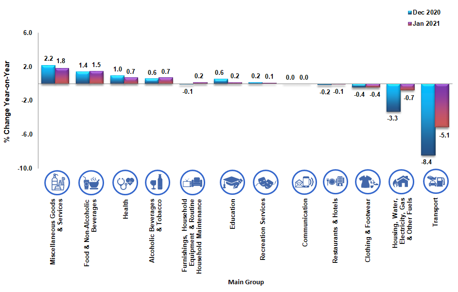 Core index rose 0.7 per cent in January 2021 as compared to the same month of the previous year. Among the major groups which influenced the increase were Miscellaneous Goods & Services (1.8%); Food & Non-Alcoholic Beverages (1.2%); Health (0.7%); Housing, Water, Electricity, Gas & Other Fuels (0.5%); Furnishings, Household Equipment & Routine Household Maintenance (0.2%) and Education (0.2%).