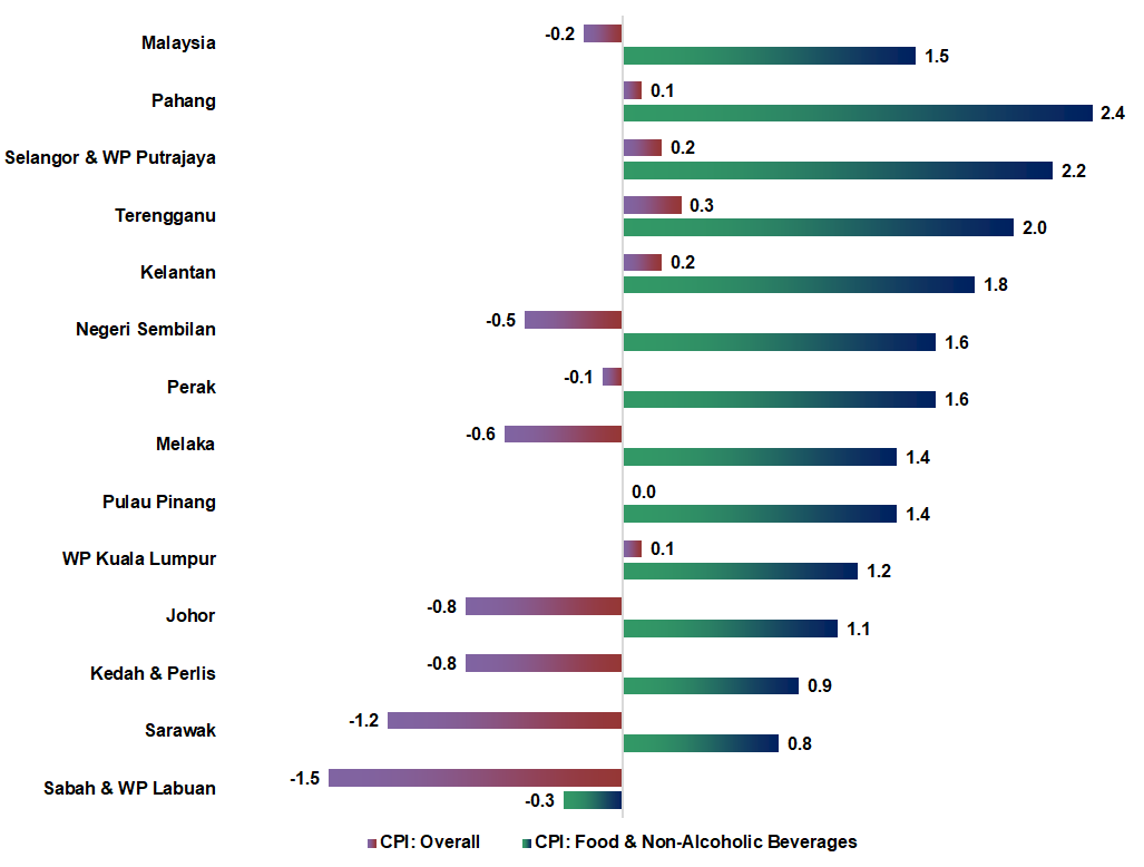 All states except Sabah & Wilayah Persekutuan Labuan registered an increase in the index of Food & Non-Alcoholic Beverages. The highest increase was recorded by Pahang at 2.4 per cent. This was followed by Selangor & Wilayah Persekutuan Putrajaya (2.2%), Terengganu (2.0%), Kelantan (1.8%), Perak (1.6%) and Negeri Sembilan (1.6%).