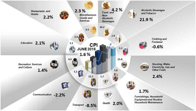 The Consumer Price Index (CPI) for June 2016 increased by 1.6 per cent to 114.8 compared with 113.0 in the same month last year. Among the major groups which recorded increases were the index for Alcoholic Beverages & Tobacco by 21.9 per cent; Food & Non-Alcoholic Beverages (+4.2 per cent); Housing, Water, Electricity, Gas & Other Fuels (+2.4 per cent); Miscellaneous Goods & Services (+2.3 per cent); Restaurants & Hotels (+2.2 per cent) and Education (+2.1 per cent). In addition, the overall index is also influenced by the decrease in prices of Transport group by 8.5 per cent; Communication (-2.2 per cent) and Clothing & Footwear (-0.6 per cent).