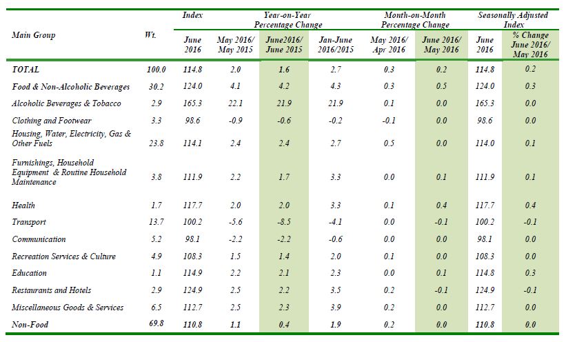 On a monthly basis, CPI for June 2016 increased 0.2 per cent to 114.8 from 114.6. CPI for the period January to June 2016 registered an increase of 2.7 per cent as compared to the same period last year.