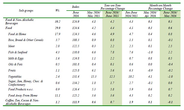 The increase of 0.5 per cent in the index for Food & Non-Alcoholic Beverages in June 2016 compared with the previous month was due to the result of an increase in the index for Food At Home by 0.8 per cent and Food Away From Home (+0.2 per cent) while index for Coffee, Tea, Cocoa & Non-Alcoholic Beverages decreased 0.1 per cent (Table 2).