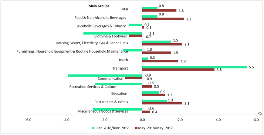 For the first time within 40 months, the Consumer Price Index (CPI) recorded a value below 1.0 per cent in June 2018. The CPI stood at 0.8 per cent compared to 1.8 per cent in May 2018. A total 168,000 quotations were obtained from 21,800 establishments all over Malaysia showed decreases in all main groups except Transport group (+5.5 per cent) in June 2018 (May 2018:+3.8 per cent) especially for sub-group Fuels & Lubricants for Personal Transport Equipment 10.2 per cent (May 2018: +5.3 per cent). The increase in the Transport group was due to higher fuel prices in June 2018 as compared to the same period of the previous year, where the price of RON95 was RM2.20 in June 2018 (June 2017: RM2.00), RON97 RM2.58 (June 2017: RM2.27) and Diesel RM2.18 (June 2017: RM1.92).(Chart 1)
