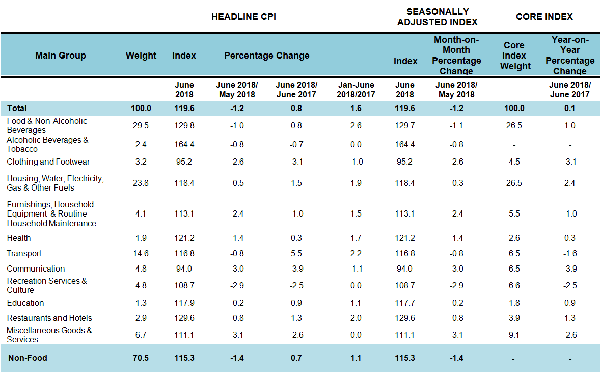 Core inflation rose 0.1 per cent in June 2018 as compared to the same month of the previous year. Among the major groups which influenced the higher core rate were price increases for Housing, Water, Electricity, Gas & Other Fuels (+2.4 per cent), Food & Non-Alcoholic Beverages (+1.0 per cent) and Education (+0.9 per cent). Core inflation, which excludes most volatile items of fresh food, as well as administered prices of goods and services recorded changes ranging from 0.1 per cent to 2.2 per cent in the period January to June 2018 as compared with the same period of the previous year.(Table 2)