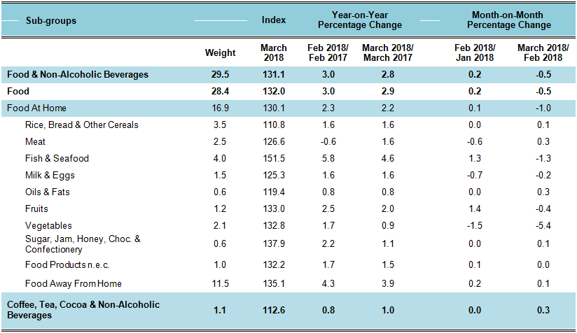 The overall index for Food & Non-Alcoholic Beverages which accounted 29.5 per cent in the CPI weights, increased 2.8 per cent in March 2018. The increase was driven by food sub-group index which comprised of Fish & Seafood (+4.6 per cent), Fruits (+2.0 per cent), Milk & Eggs (+1.6 per cent), Sugar, Jam, Honey, Chocolate & Confectionery (+1.1 per cent) and Vegetables (+0.9 per cent). Slowing in pace of 0.9 per cent for the sub-group Vegetable index in March 2018 (February 2018: 1.7 per cent) was due to the index of goods which showed a drop in most states such as Long Beans (-8.3 per cent), Round Cabbage (-7.5 per cent) and French Beans (-7.5 per cent). Meanwhile, the index for Food Away From Home increased 3.9 per cent in March 2018.