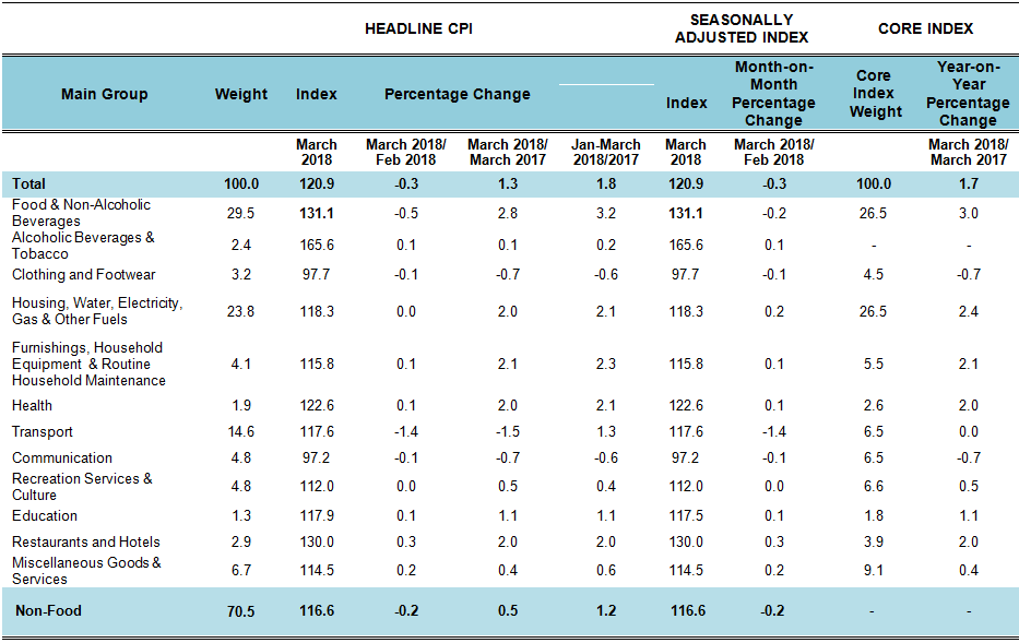 On a monthly basis, CPI decreased 0.3 per cent as compared to February 2018. CPI for the period January-March 2018 registered an increase of 1.8 per cent as compared to the same period last year.