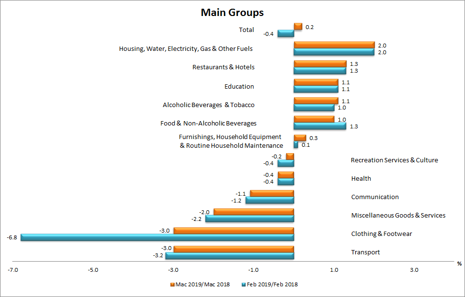 Chart 1: Consumer Price Index (2010=100): Percentage Change by Main Groups, Malaysia, March 2019/March 2018