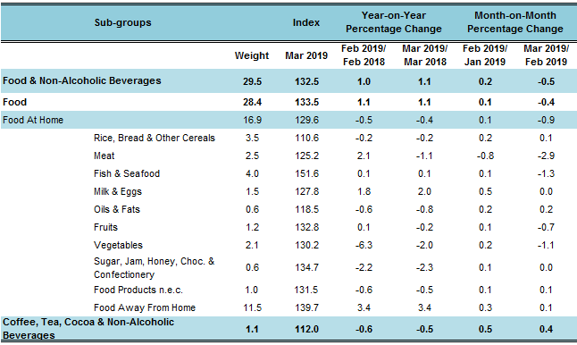 The overall index for Food & Non-Alcoholic Beverages increased 1.1 per cent in March 2019. The increase was attributed by the food sub-group index of Milk & Eggs (+2.0 per cent) and Fish & Seafood (+0.1 per cent).