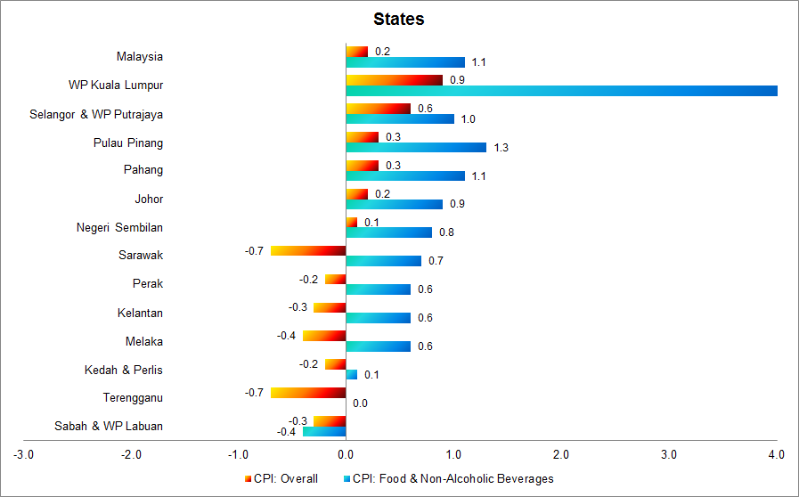 Four states namely Wilayah Persekutuan Kuala Lumpur (+0.9 per cent), Pulau Pinang (+0.6 per cent), Selangor & Wilayah Persekutuan Putrajaya (+0.3 per cent) and Negeri Sembilan (+0.3 per cent) surpassed the national CPI rate of 0.2 per cent in March 2019 as compared to March 2018. Meanwhile, Johor showed the same rate of increase as the national CPI.