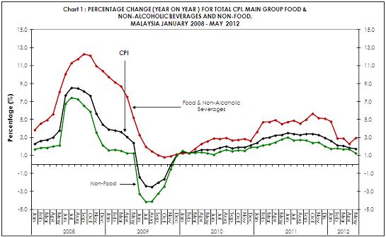 The index for Food & Non-Alcoholic Beverages and Non-Food for the month of May 2012 showed increases of 3.0 and 1.2 per cent respectively as compared to the same month in 2011. For the period January to May 2012, the index for Food & Non-Alcoholic Beverages and Non-Food increased by 3.2 and 1.5 per cent respectively. Compared with the previous month, the index for Food & Non-Alcoholic Beverages increased by 0.7 per cent while index for Non-Food remained unchanged at 103.7 (Table 1).