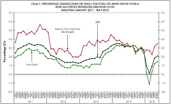 Overall, the index for Food & Non-Alcoholic Beverages rose 3.5 per cent on a year-on-year basis in May 2015 as compared with the index for Non-Food which increased only 1.4 per cent (Chart 1 and Table 1).