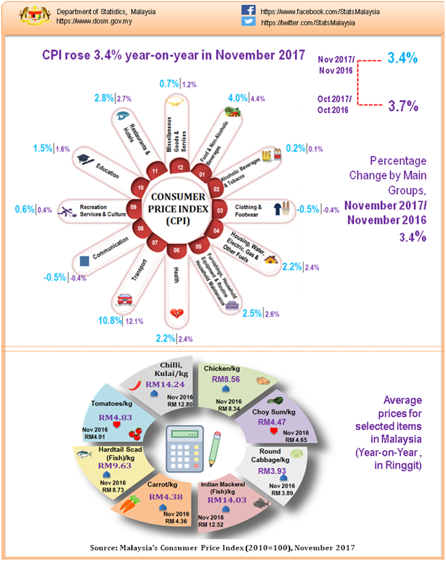 CPI for the period January to November 2017 registered an increase of 3.9 per cent compared with the same period last year. The index for Food & Non-Alcoholic Beverages was the main contributor to the rise in CPI for the period January to November 2017, registering an increase of 4.3 per cent. The increase was contributed by the index for Food Away From Home (+4.7 per cent) and Food At Home (+4.2 per cent). While, the index for Coffee, Tea, Cocoa & Non-Alcoholic Beverages decreased 0.3 per cent. Among the subgroups of Food At Home which showed significant increases during this period as shown in Table 2 were Oils & Fats (+33.0 per cent), Fish & Seafood (+6.7 per cent), Vegetables (+4.1 per cent), Fruits (+3.4 per cent) and Meat (+3.0 per cent).