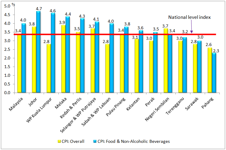 In terms of overall CPI, five states surpassed the national CPI rate of 3.4 per cent namely Johor, Melaka, Kedah & Perlis, Selangor & Wilayah Persekutuan Putrajaya and Pulau Pinang.