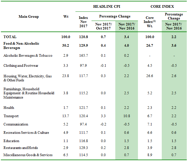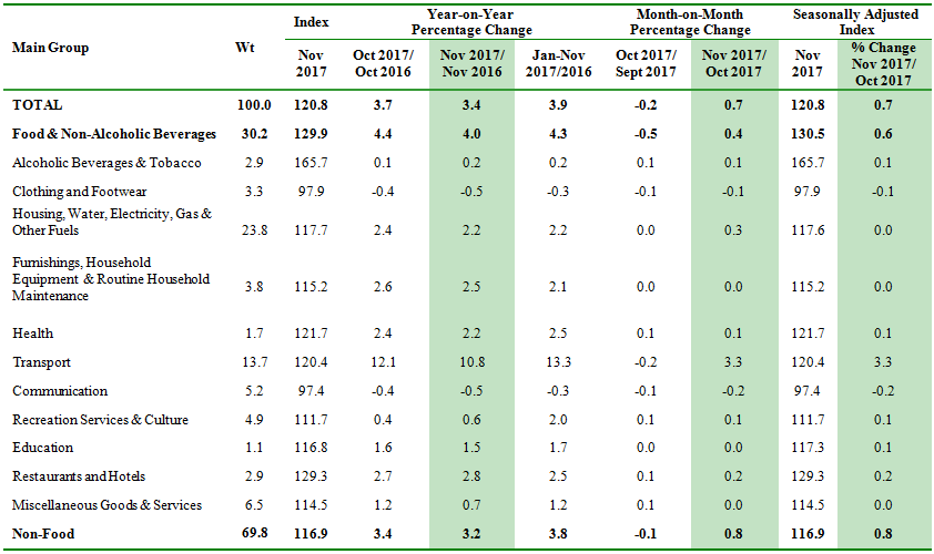 The overall index for CPI rose by 3.4 per cent to 120.8 in November 2017 from 116.8 in the corresponding month of the preceding year. Among the major groups which recorded increases were the indices for Transport (+10.8 per cent), Food & Non-Alcoholic Beverages (+4.0 per cent), Restaurants and Hotels (+2.8 per cent), Furnishings, Household Equipment & Routine Household Maintenance (+2.5 per cent), Health (+2.2 per cent) and Housing, Water, Electricity, Gas & Other Fuels (+2.2 per cent). (Table 1)
